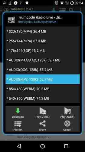 TubeMate is an application that allows you to download youtube videos in several formats - including audio. As you are probably aware, YouTube is one of the best places to listen to your favorite music, and thanks to TubeMate it is one of the best places to download it.