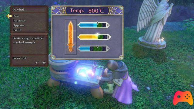 At this point we will find ourselves in front of a minigame: it will be necessary to keep an eye on the working temperature and try to hit the illuminated area of each bar to have the best forging possible. Initially the process will seem very random, but by leveling up you will be able to acquire skills that will allow you to perform special shots and at the same time increase your Concentration points (which are used to perform these moves) and therefore obtain the much-desired "Perfect" judgment, which guarantees the achievement of level +3.