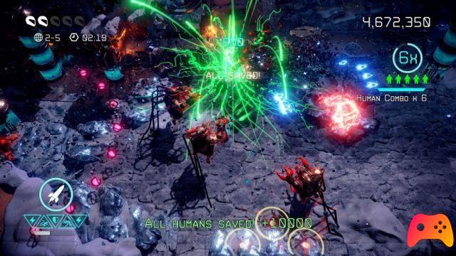 The latter will find themselves facing another, perhaps more difficult challenge for their patience: the difficulty of Nex Machina is clearly above the videogame average since Beginner mode, to the point that to date only 20% of game owners have managed to finish the 5 short but intense worlds of Arcade mode at that difficulty. This involves a consecutive challenge, level after level, of hordes upon hordes of aliens and hostile machines to be killed and humans to be rescued.