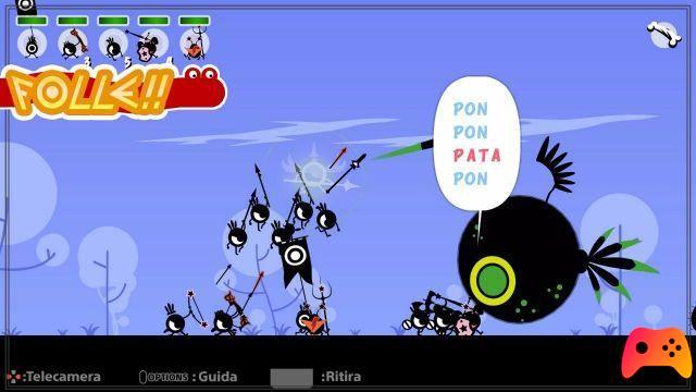 Cependant, il ne suffira pas de simplement jouer les bonnes combinaisons de commandes pour assurer la victoire, mais il faudra aller au rythme des battements des chansons de fond des cartes. Plus vous serez synchronisé, plus vous augmenterez la barre de combo, qui une fois que vous aurez atteint le niveau «Insane» vous permettra d'utiliser des mouvements spéciaux appelés miracles, également lancés à travers un mini-jeu sur le thème de la musique. En bref, la musique est littéralement la vie et la mort pour les Patapons, et comme eux Kami, ce sera au joueur de leur donner l'énergie dont ils ont besoin pour le voyage. Les commandes qui peuvent être données ne sont en fait pas nombreuses ou particulièrement variées, cependant combiner leurs effets avec des entrées rythmiques puis répétées par les Patapons est toujours satisfaisant et amusant, surtout lorsque pendant les assauts plus longs vous arrivez à créer un chaos audiovisuel considérable sur l'écran.